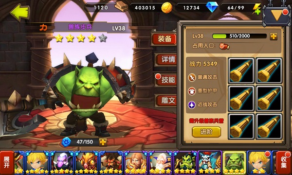这是一个有魔性的游戏(请注意)。最开始,策略性仅仅体现在绿色箭头、红色箭头的克制关系上。可是过了一会儿,笔者发现“咦,什么鬼,怎么打不到这个怪?”——原来阵型分为前后排,在前排有单位的情况,无法攻击后排。过了不到2分钟,笔者迎接来了信息大爆炸。原来游戏不仅阵型分为前后排,还有魔法AOE,物理溅射、闪避、暴击等影响因素和特性。而且每个英雄对应有三维成长、4个技能,有些关卡用自动攻击挂机根本没法通关,手动选择却可以轻松三星通过,更有英雄间无数战术排列组合,满足某些条件的上场阵容还会激活不同的反应......等等等等