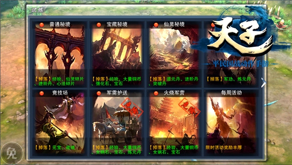 手游玩法历来强调简约,但这也让游戏的内容的多样性有所下降。《天子》手游在这方面则做了开拓性的探索:既不抛弃手游简约的精华,同时又融入端游的丰富游戏内容。而在这其中,《天子》则秉承手游玩法简约的特征,摒弃了传统的千篇一律刷小地图的玩法,采用开放式大地图的呈现方式将诸多副本剧情性内容相互穿插,让玩家可以像在端游上自由探索,无关卡、无限制,玩家可以随心所欲推进剧情、完成任务、获得成长,享受到既简单又富有趣味的游戏体验!