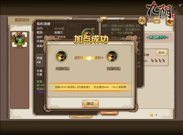 评测分析:架招“鬼附魂缠”,在初始状态下仅有20%几率才会触发厉鬼欺身效果,几率相对较低,但随着玩家通过搜集道具对该技能进阶后,其释放厉鬼欺身几率、眩晕几率和减伤幅度都大大提高,提升到4阶的“鬼附魂缠”,成功招架住敌人的攻击后,有60%的几率给目标添加【厉鬼欺身】效果,并在反击时减伤达到99%,有着高达75%的几率【眩晕】敌方3秒。该技能无论在PVE还是PVP都是锦衣卫常用的技能,在防范敌人攻击的同时还可有效反击,并且对敌方施加锦衣卫的特效,建议着重进阶。