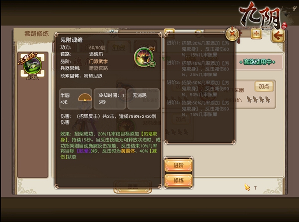 初始状态下的架招“鬼附魂缠”,在招架成功后,有20%几率给目标添加【厉鬼欺身】,持续15秒,当反击技能为可释放状态时,成功招架则自动施展反击技能,反击结束10%几率将目标【眩晕】3秒,反击时为黄霸体,40%【减伤】状态。