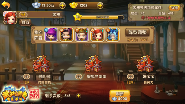 同福客栈开业了,但是没钱买菜了怎么办?不用担心!开启客栈抢夺模式,直接从别家客栈抢夺原料或者成品,再也不用担心完不成订单得罪客人了。如果有别人抢了你客栈的东西,还可以点击复仇按钮去抢回来,让大家体验到客栈经营的乐趣。而客栈升级后还会给所有上阵的武将带来属性加成, 让你的整体战斗力更高!