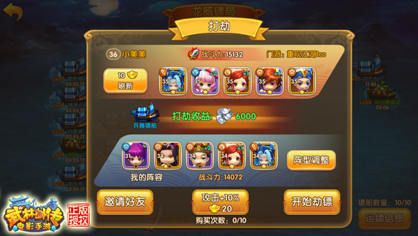 在江湖上有一定名气后,就可以开始劫富济贫,做一名真正的大侠。在龙威镖局系统中,大家通过运镖和劫镖来获取游戏资源。运镖一次只能运一艘镖船,可以获得大量银两或者其他物品,但是有被劫镖的风险。而劫镖只需要系统页面上有镖船就可以劫,如果劫镖时发现对方战斗力高,还可以邀请自己的好友帮忙劫镖,每次劫镖成功都会收获各种资源,用来购买武将碎片、青龙符等多种道具。