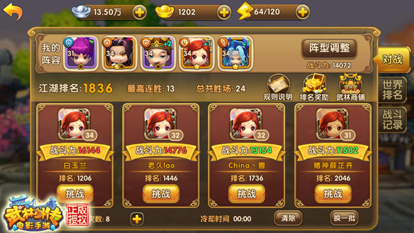 初入江湖的新手,首要任务就是提升自己的江湖排名,打出自己的名号!而武林争霸正是为你准备的新手pvp系统。在其中向别的玩家发起挑战,击败对手后不仅排名会提高,而且对应的排名奖励也会提高。对战时可以先观察对方的阵容和战斗力,根据武将的克制来调整自己的阵容,在战斗后无论输赢都可以获得相应的武林币,而武林币可以去武林商铺兑换稀有武将碎片哦。