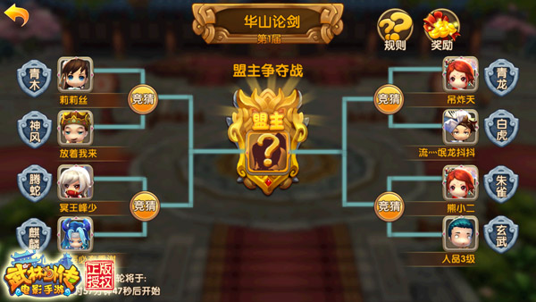 江湖中人的最高荣誉便是参加华山论剑,成为武林盟主!游戏中华山论剑每周举办一次,分为四个阶段,报名—小组赛—豪侠争夺战—盟主争夺战,所有的对战均采取单场淘汰制,最终夺得武林盟主称号的玩家将会获得丰厚的奖励。另外还有竞猜环节等着大家,只要猜对最终获胜者,超多银两等着你!