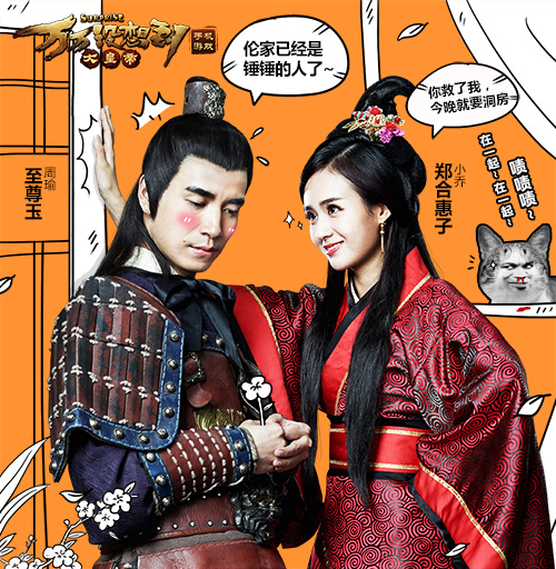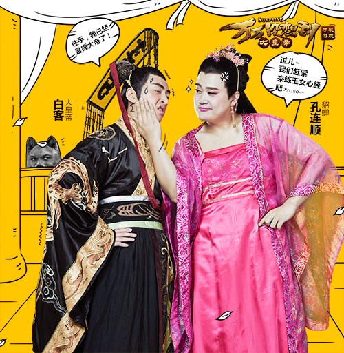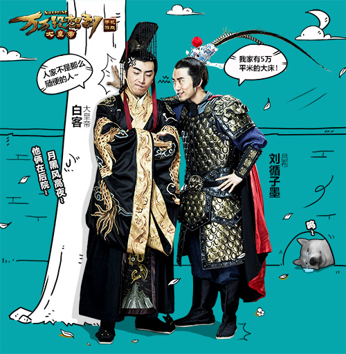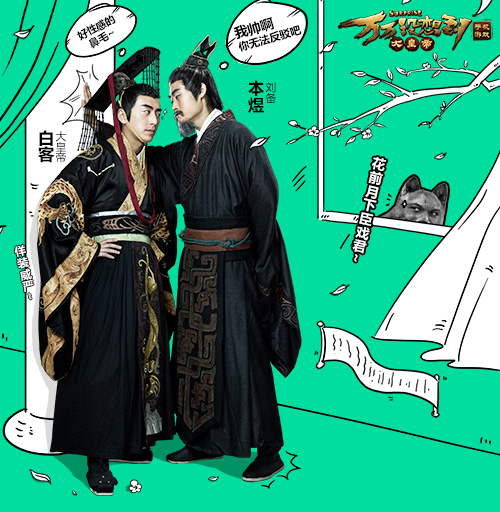 电影《万万没想到》独家授权手游《万万没想到之大皇帝》特邀白客、孔连顺、本煜、至尊玉、王玲玉、刘循子墨和郑合惠子七人,分饰游戏中的三国君主、武将、美女,上演了一出诙谐逗趣的壁咚秀。
