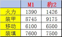 与真实的M1相比,游戏中的M1比较逊色,这是一款与豹2齐名的主战坦克,但游戏中相对于豹2,却是略显不足,首先在数值上对比: