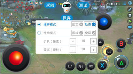 在这里,左摇杆控制的是英雄的移动,A键对应的是常规的攻击,每个技能都有对应的手抦键位,特别是很多玩家反馈的,指向性技能无法在手柄上实现也完美的解决了,只要把右摇杆设置摇杆模式,动态即可,放在屏幕上空白的任意位置,按动技能键,拖动右摇杆,完美的模拟了指向性技能。